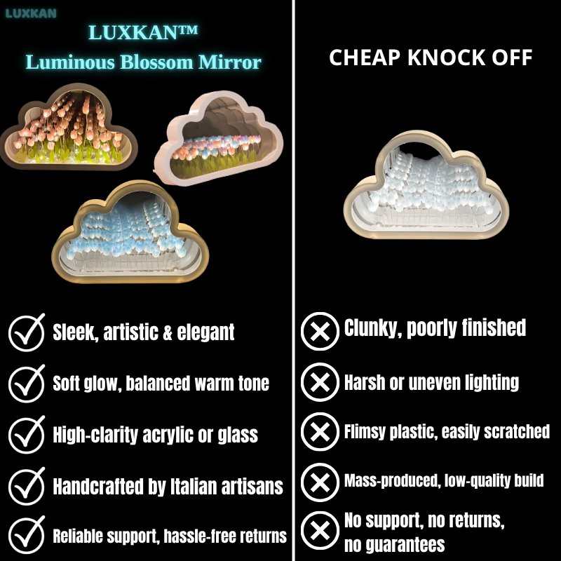By day, the Luminous Blossom Mirror – LUXKAN™ shines as a sleek, cloud-shaped mirror. But when night falls, soft tulip lights bloom from within, casting a gentle, calming glow. Carefully handcrafted by Italian artisans with artistic precision, this mirror is more than décor — it’s a magical piece that transforms any space into a peaceful garden of light.